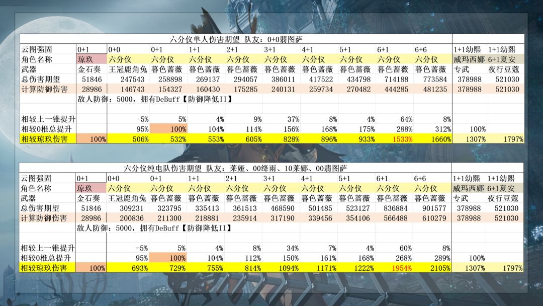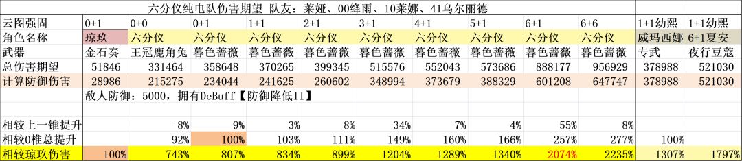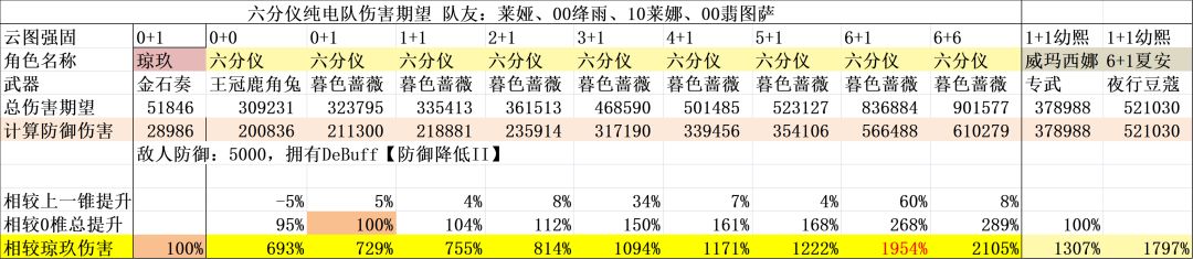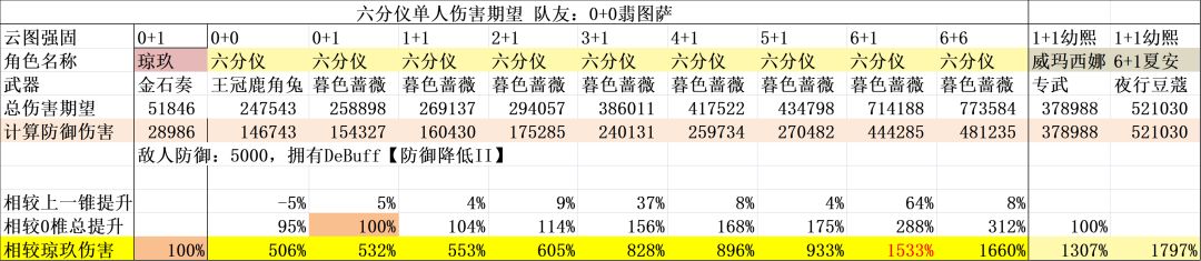 那么,主c流六分仪的输出是个什么水平呢?0+0就有5玖水平,属于是最高的那一档,但是缺点是需要绑定一个翡图萨发射器。满椎情况下和翡图萨2人的15玖伤害期望,对比夏安幼熙2人的18玖还是有一定差距的。如果此时在加上电队的辅助,那么输出能力就会暴涨到21玖。这里的21玖看起来比夏安高了不少,但是要注意六分仪是绛雨+翡图萨两个人拐的伤害,对比夏安只有幼熙一个人拐的伤害,绛雨和翡图萨低椎基本都没有伤害。这个配队看似4个人,实机上六分仪只能吃到绛雨的拐,所以实际上3个人对比2个人。