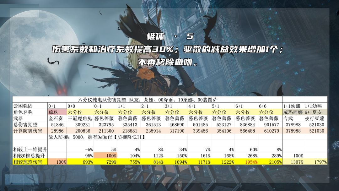 五椎:等于每回合多60%倍率。不再移除血吻目前来看没有用,推测和刘莳椎体一样,是初版遗留下来的无效效果。总伤害提升4%。