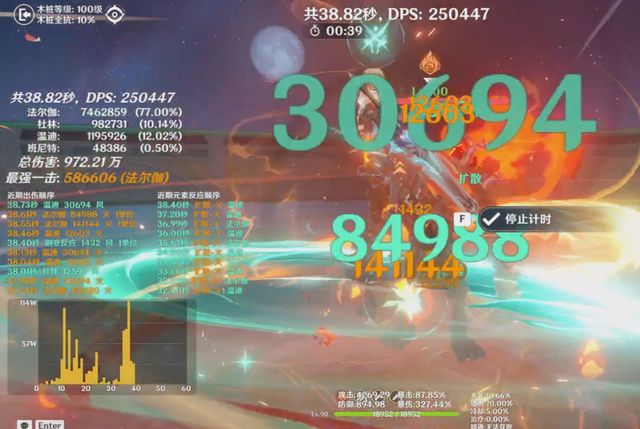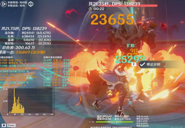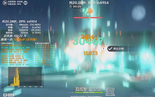 第四轮测试,我们把法尔伽1命点了,为确保提升数据的准确、直观,在不改变圣遗物的情况下,我们延用第二轮满命温迪,在阵容里的dps,通过几轮的打桩测试,1命法尔伽的队伍,Dps最终来到了14万左右,应该是手残原因,还得多试几次。