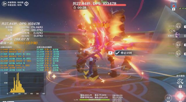 通过千星奇域dps测试工具的实测来看,第一轮测试,法尔伽在完整魔导配队的情况下,最终结算,DPS能达到11万,后段掉buff后,重新启动的时候,Dps会有较大的下滑,所以从这里来看,大家一定要注重减抗、增伤辅助的充能,以提高队伍的dps。