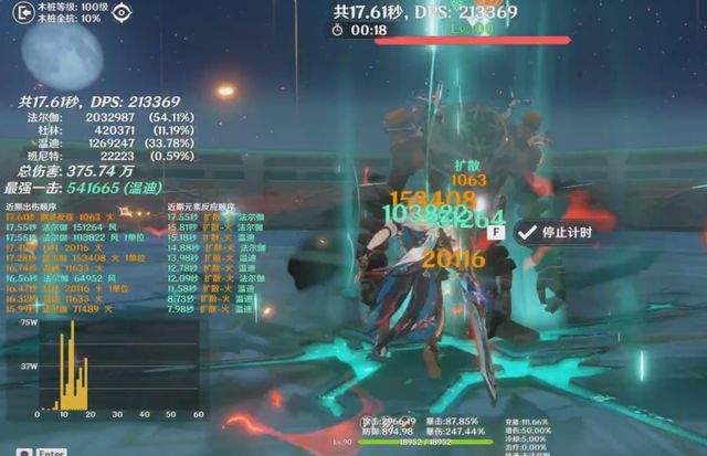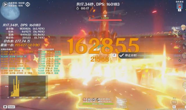 第二轮测试,为了做对比,我们将4命琴换成温迪,由于温迪是满命,所以,后续命座的测试,我们都按照有温迪的固定配队来测试,那么经过打桩数据来看,有温迪的情况下,法尔伽队伍的dps来到了16万左右。