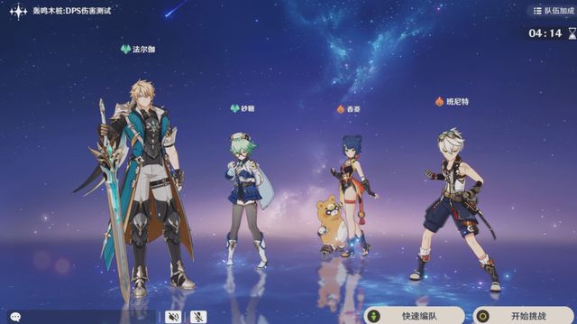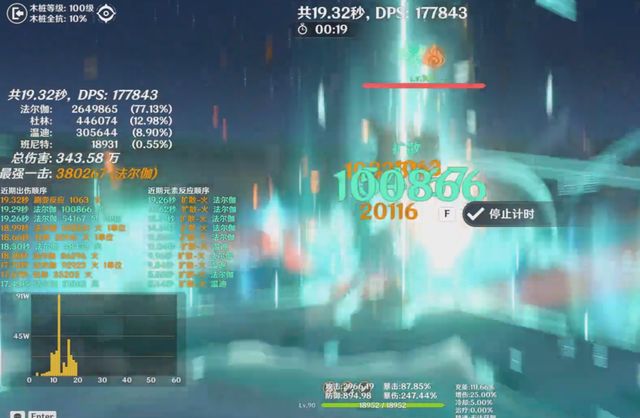先看第一轮测试,出战角色为0命法尔伽、2命杜林、4命琴、满命班尼特,在当前版本,这是法尔伽相较完整的配队,原因很简单,根据法尔伽的机制来看,想吃满天赋倍率,只能组双风+任意(水、火、雷、冰)角色。