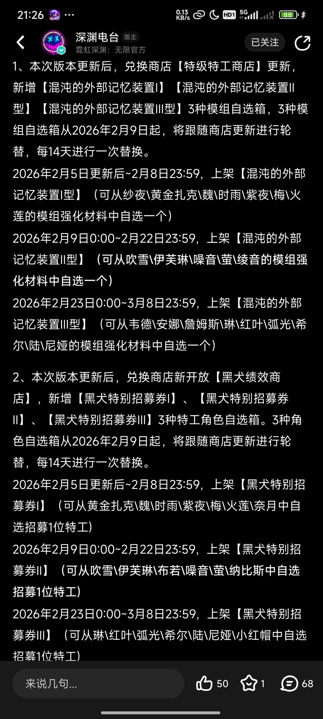 2026年2月9日0:00~2月22日23:59,上架【混沌的外部记忆装置||型】(可从吹雪\伊芙琳\噪音\萤\绫音的模组强化材料中自选一个)