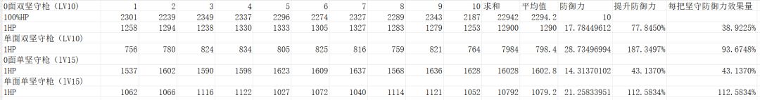 1HP单面加护情况下,15技坚守枪受到斯文托维特普攻10次伤害平均值为1079.2,得防御力大致为21.2583,得出提升防御力约为112.5834%,1HP情况下单面加护坚守枪防御力提升量约为112.5834%