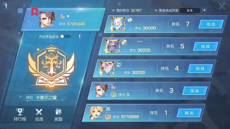 赛季开启后排行榜与段位将全部重置。每日前5次挑战可获得核元能量、时空之砂、龙魂之力等奖励;每累计获得10次胜利奖励(购买的额外挑战次数不计入)还可获得一份卡塞尔圣印嘉奖。
