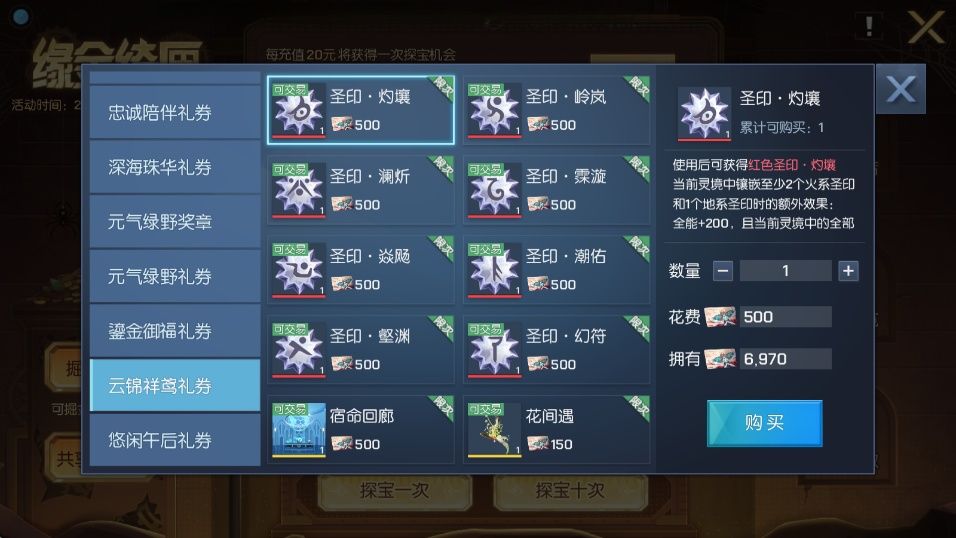 同时,使用云锦祥鸢礼券可兑换红色圣印·灼壤、红色圣印·岭岚、红色圣印·澜炘、红色圣印·霂漩、红色圣印·焱飏、红色圣印·潮佑、红色圣印·壑渊、红色圣印·幻符、个人名片·宿命回廊、背饰·福袋满财、头饰·花间遇、凛冬芭蕾曲·衣、凛冬芭蕾曲·发,凛冬芭蕾曲·头饰等众多珍稀奖励。