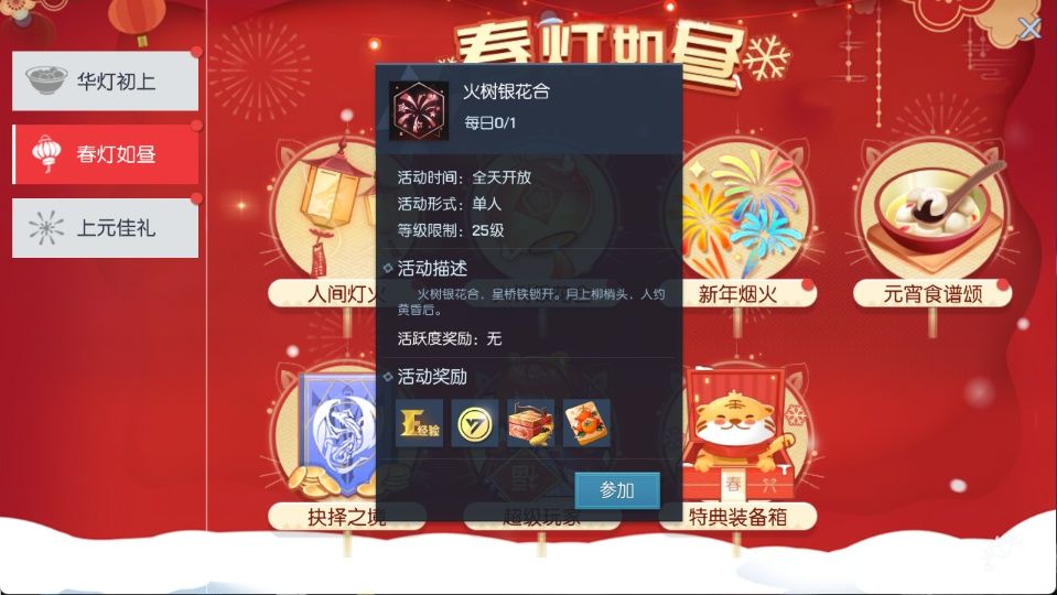 2月26日6:00-3月11日24:00期间,每天参与新年烟花秀的表演,即可获得经验、金币、金鲤曳尾礼盒、柿柿如意礼券等好礼哦~