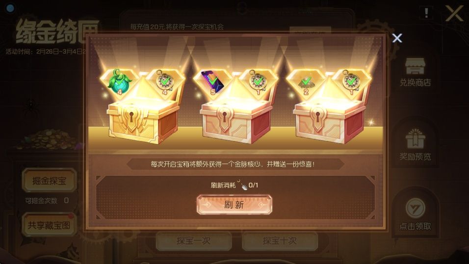 使用掘金铲,可以挖掘宝箱,收获惊喜好礼与寻金罗盘;开启金色宝箱更能为全服共享珍贵的藏金秘卷!借助寻金罗盘,你将能精准定位隐藏的宝藏,有机会获得红色圣印·灼壤、个人名片·宿命回廊、背饰·福袋满财、头饰·花间遇、凛冬芭蕾曲·衣、凛冬芭蕾曲·发,凛冬芭蕾曲·头饰等稀有奖励!
