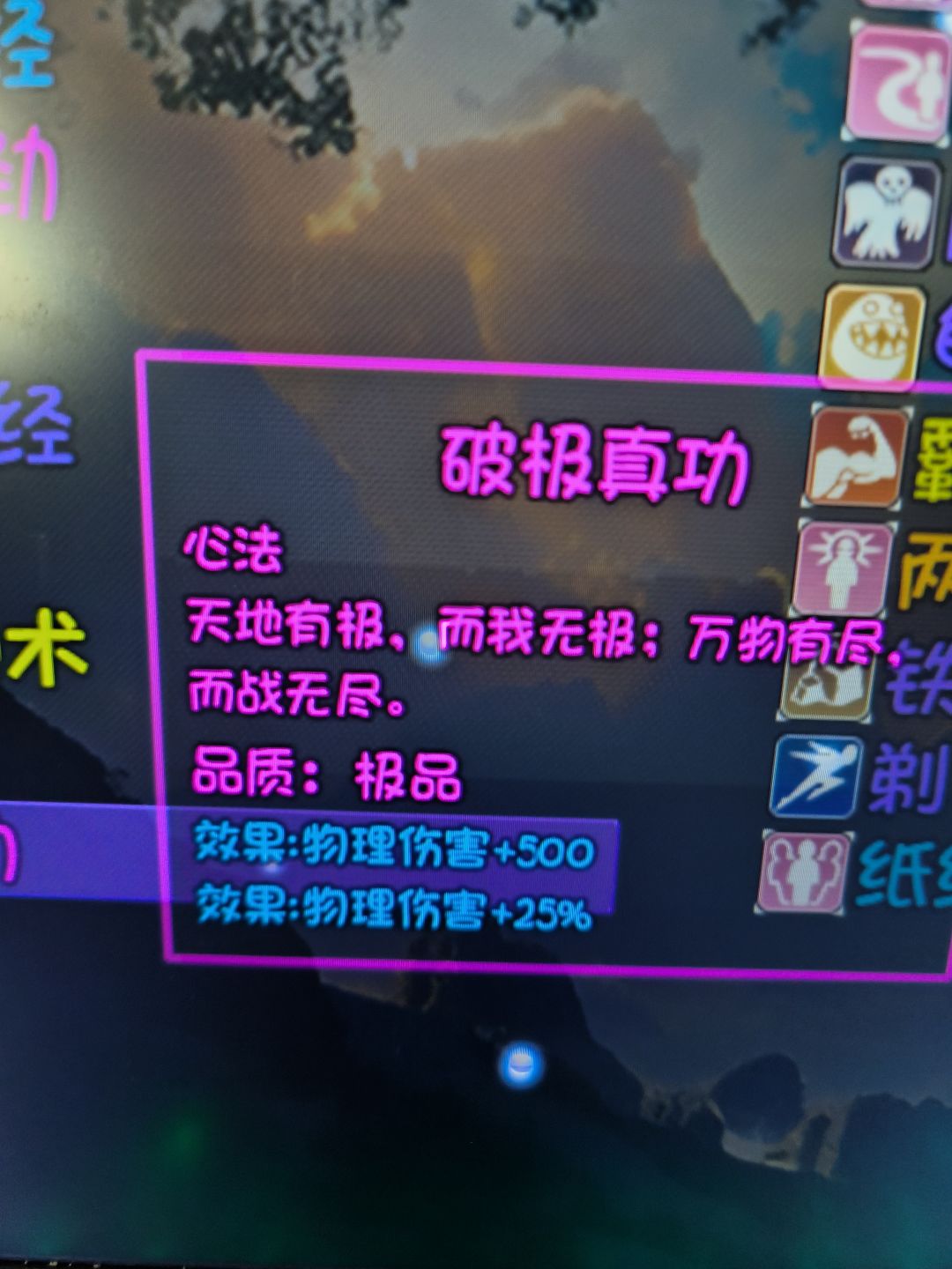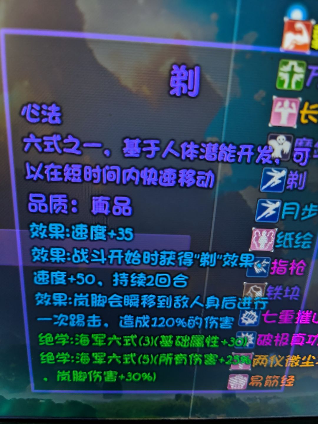 弄好一切后,我们就拥有了一个50w伤害的风法小明,和一个30-40w伤害的岚脚副c,这个时候我们去野外任何副本都是乱杀的(除了暮色修道院),喜欢的探索的小伙伴可以随便去刷刷看,出点好装备提升一下。不过我本人因为能一轮秒先古塔了,就去刷先古塔换心法了,偷不到的洗髓经在先古塔可以直接换,偷66次藏经阁不一定出洗髓经,但是刷66次先古塔绝对能换一本,在刷先古塔的时候可以注意两仪强者的出现,这个阶段打两仪强者轻轻松松,别问我为什么不早点刷,问就是吃不了那个苦。(PS:刷之前注意存档,两仪强者里有一个四鬼,强度是其他强者的四倍容易翻车)