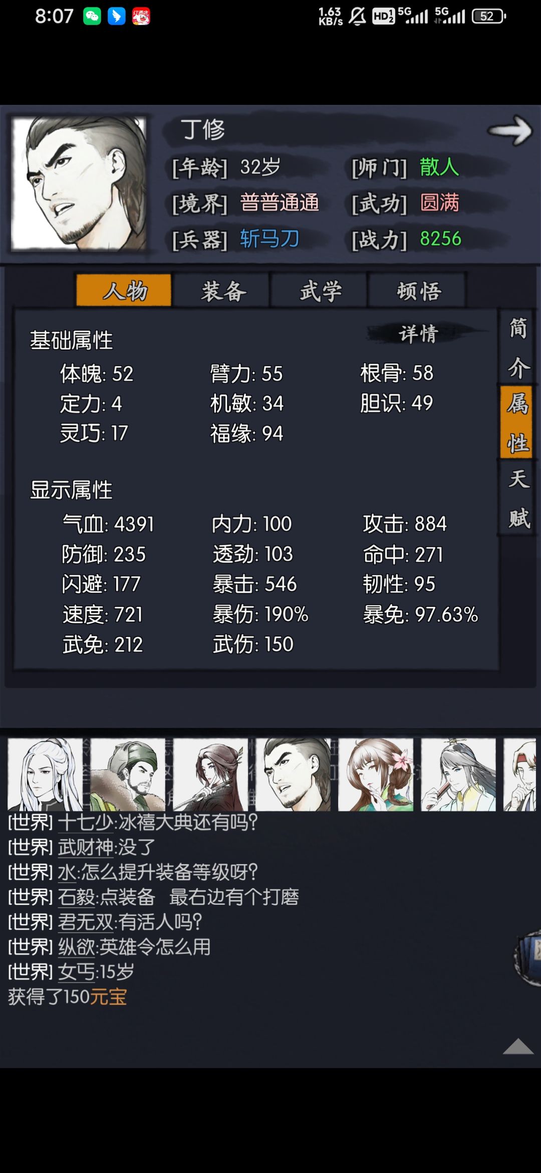 附上一张我推完八卦宫甲的时候丁修的属性图,仅供参考。