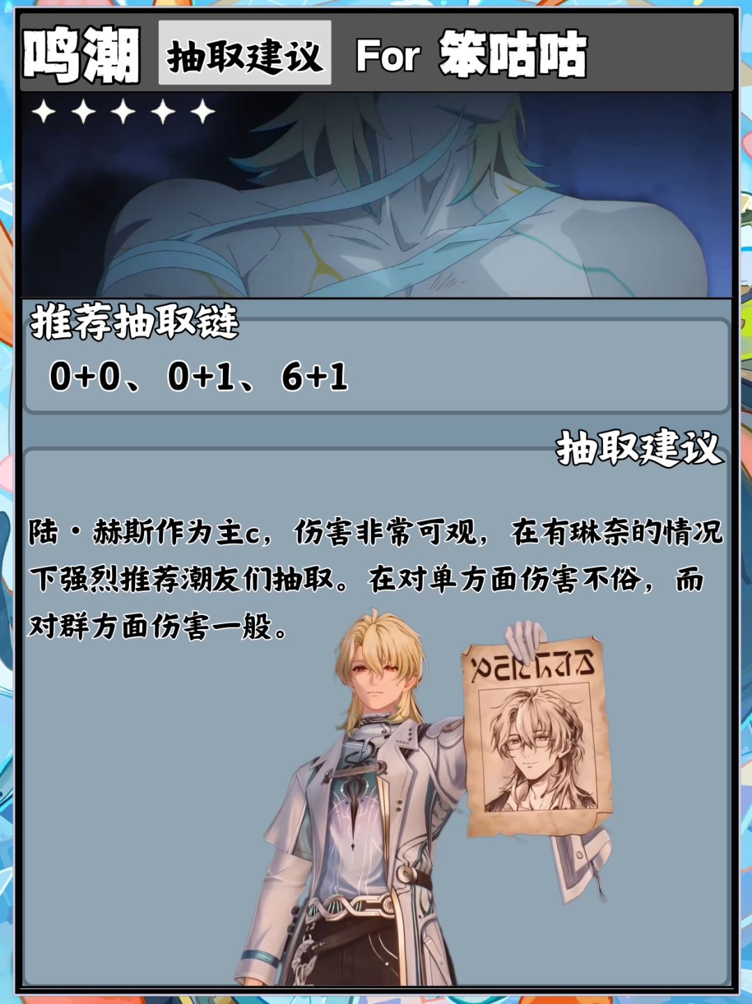 鸣潮3.1下半版本今日更新啦,那笨咕咕本期内容带来的是3.1下半版本新角色“陆·赫斯”的培养攻略~ 内含专武/声骸/配队等内容~