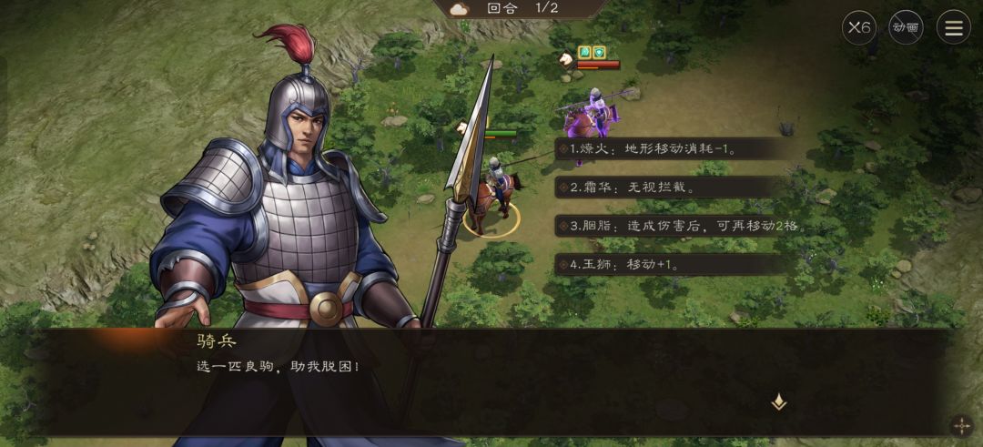 开局选马,我方到高亮区域地形平坦,所以选第四个移动加一的马,这样会更快到达目的地。