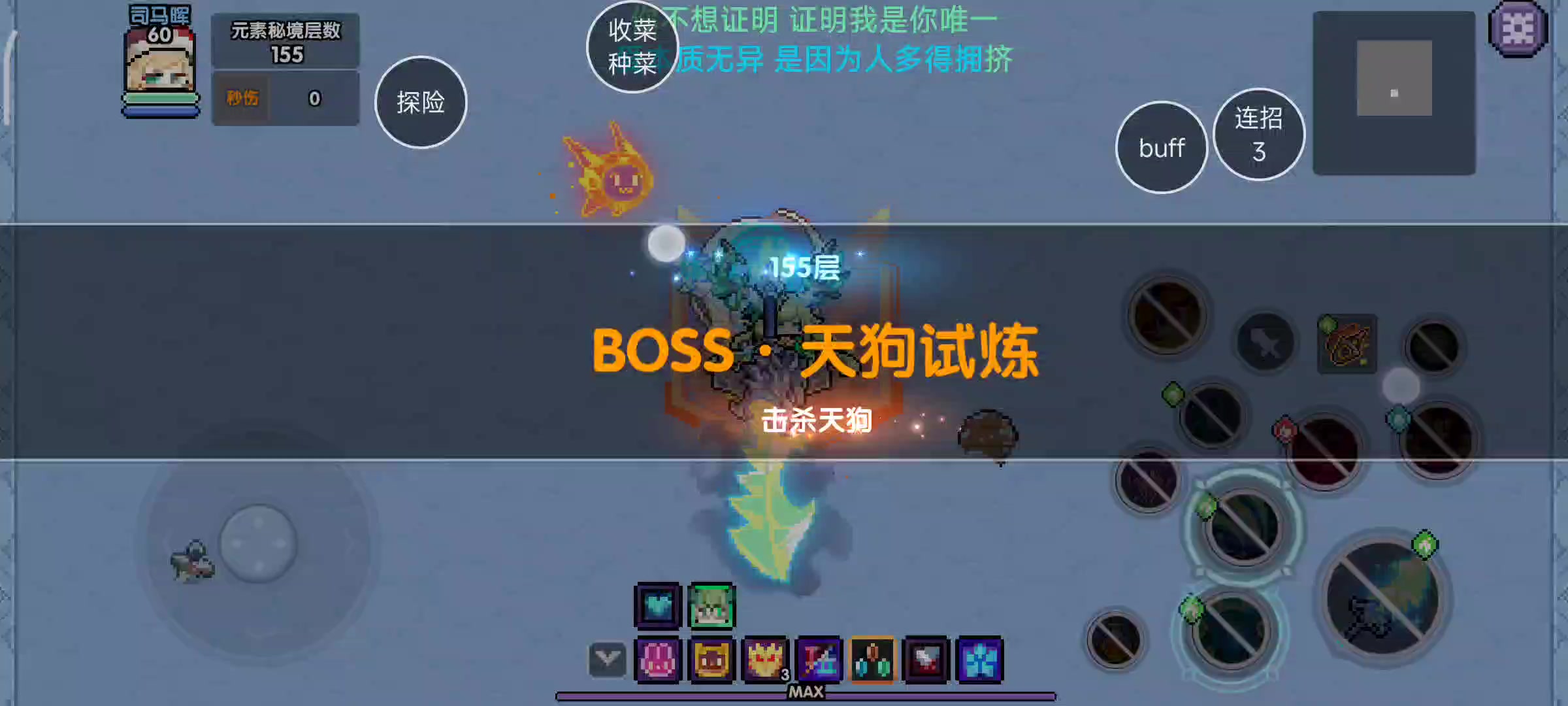 三、实战思路参考 (ps:可以在主城木桩卡一下,双狼和一发组合技的多段伤害,在打155天狗这种多动症boss的时候我们尽量贴着他走,而打到一定秒数天狗会从中间瞬移到地图左边,有时候我们会在这空半段组合技,可以像我视频那样子提前预判往左走)