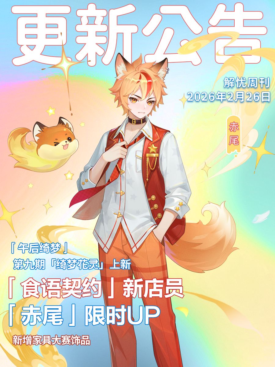 版本亮点抢先看:1)「食语契约」全新店员「赤尾」限时UP开启!(3月1日~3月15日,开服9天可参与)