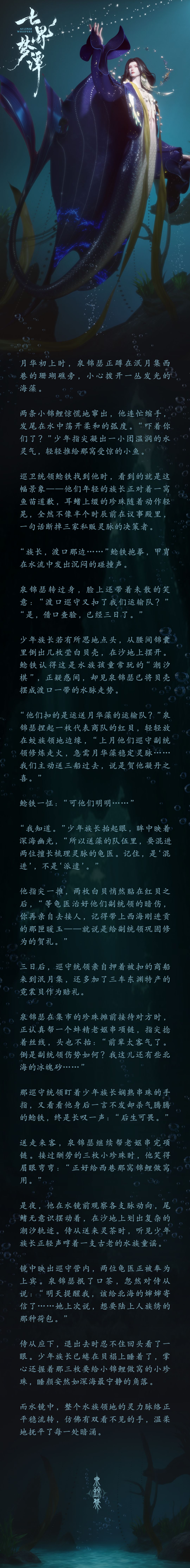 总立于珍珠台上,他常常指尖凝起柔光安抚惊动的鱼群,也总会望向靠近诡市的那片浅水海域,不知是牵挂渡口动荡,还是等待着远离族群的亲人归乡……