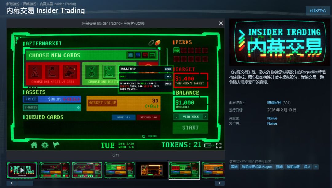 玩家需要用Roguelike牌组来构建游戏,精心搭配特性,使用药丸等操纵股价。交易风格无论是谨慎还是激进,都应避免陷入深度套牢的窘境,最终攫取巨大利润成为股神。(游戏已于2月18日正式发售)
