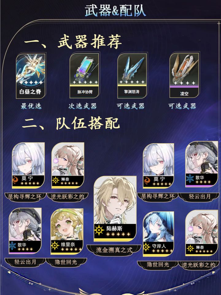 🔸陆赫斯:流金溯真之式(首选34311)首位选择双极·星升辉铳(cost3)词条cost4选择双爆、cost3选择衍射伤、cost1选择百分比攻击。副词条优先双爆>攻击%>普攻加成>其他
