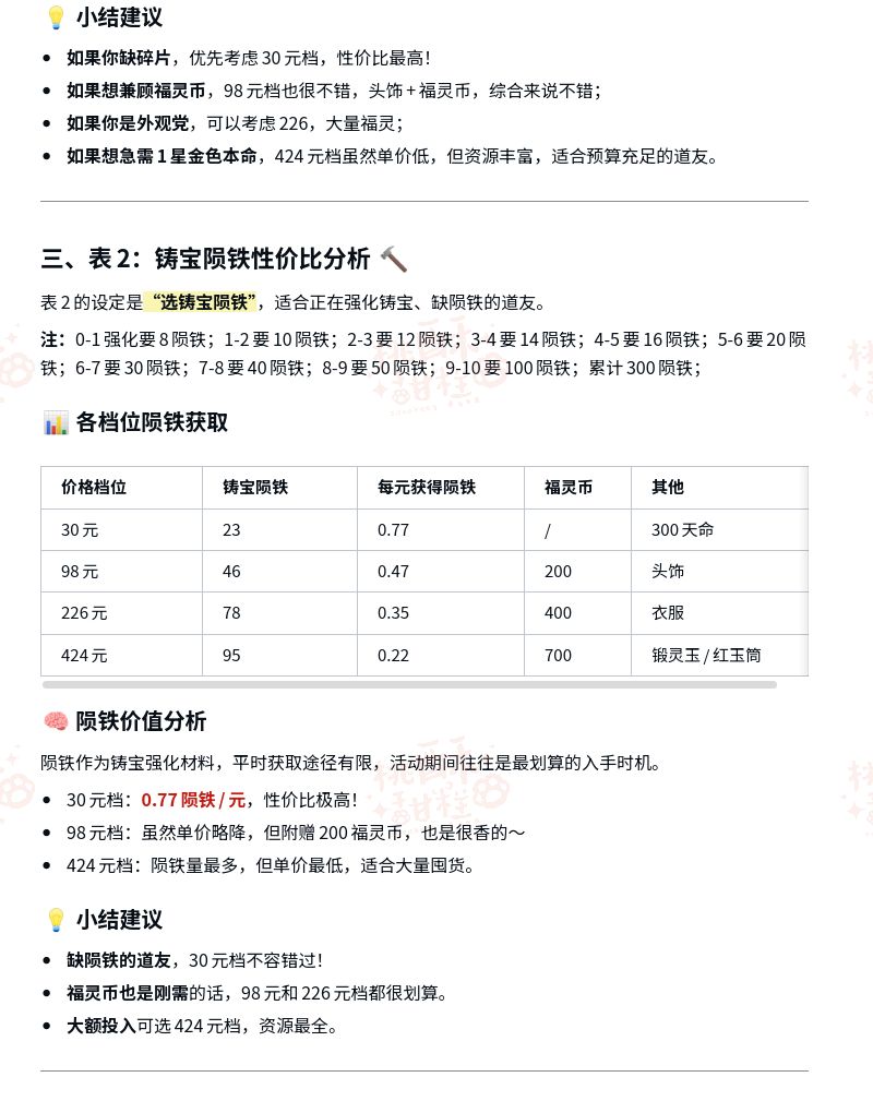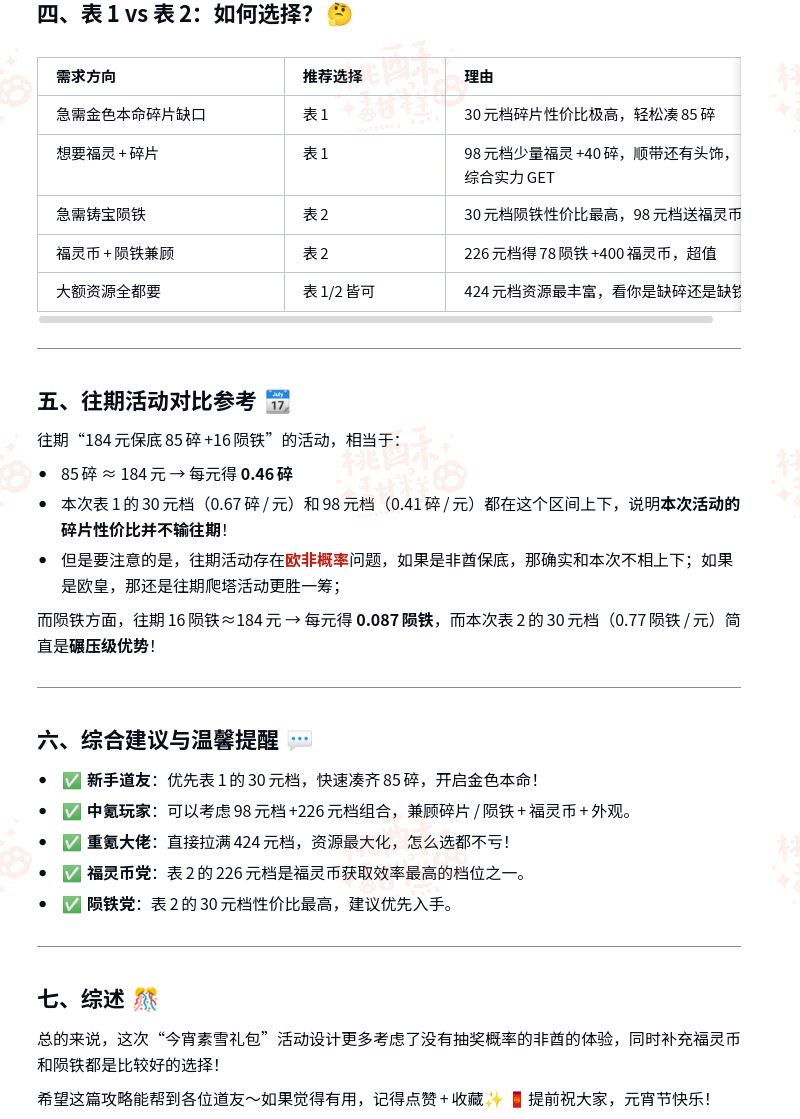 各位道友大家好呀~元宵佳节到, 节前即将上线“今宵素雪礼包”活动!是机缘转盘和本命礼包的综合活动,机缘转盘属于消耗后额外附赠这里不做单独解析,以本命礼包为重点,分为两种不同的自选礼包路线,分别侧重【金色本命碎片】和【铸宝陨铁】,结合游戏的官微直充礼包和往期本命活动数据,带大家详细拆解这两张表的性价比并做推荐✨