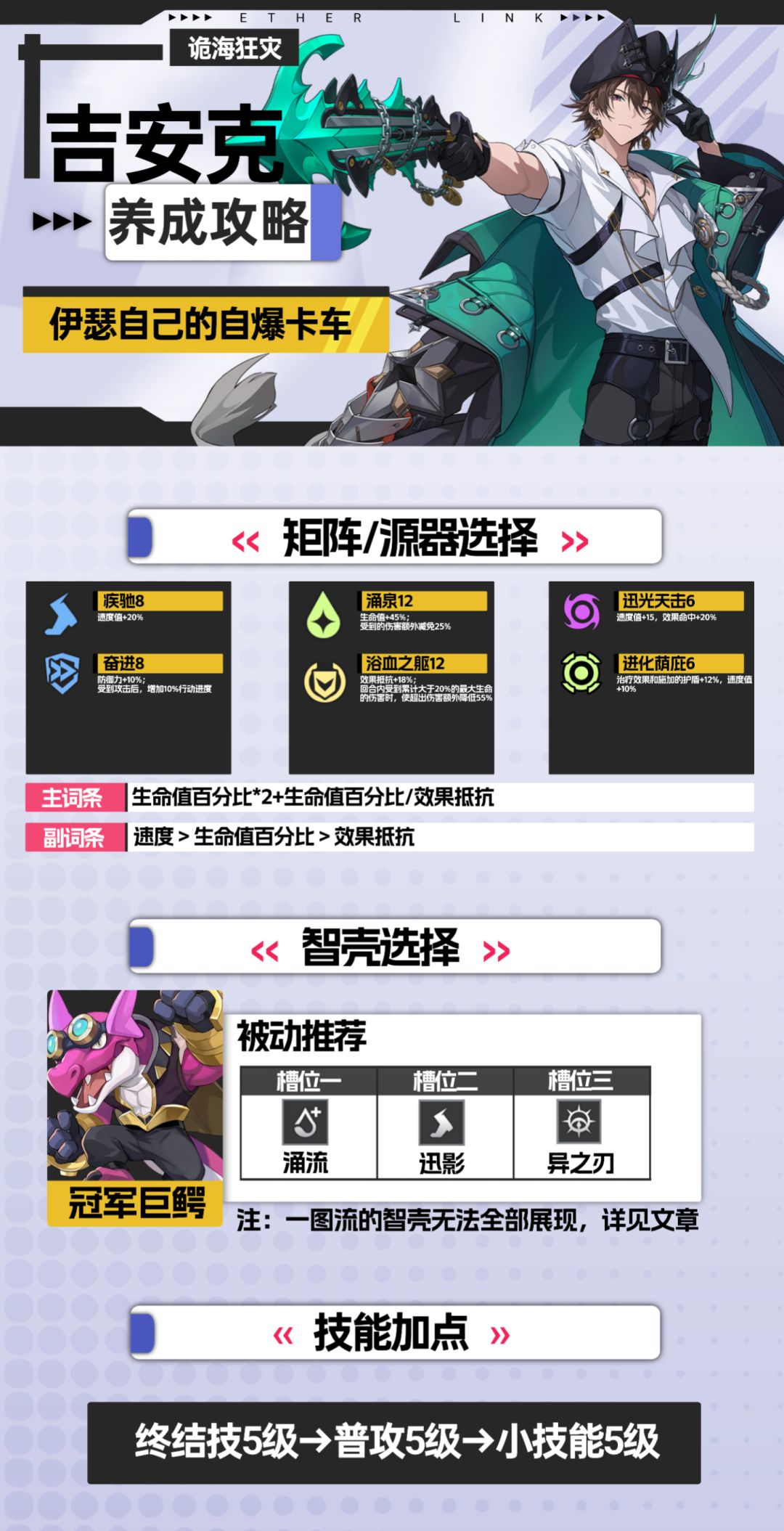 智壳方面,冠军巨鳄无论是恢复生命还是拉条都十分适配吉安克;其次可以选择胡狼卫士或千兆字节,提升行动频率