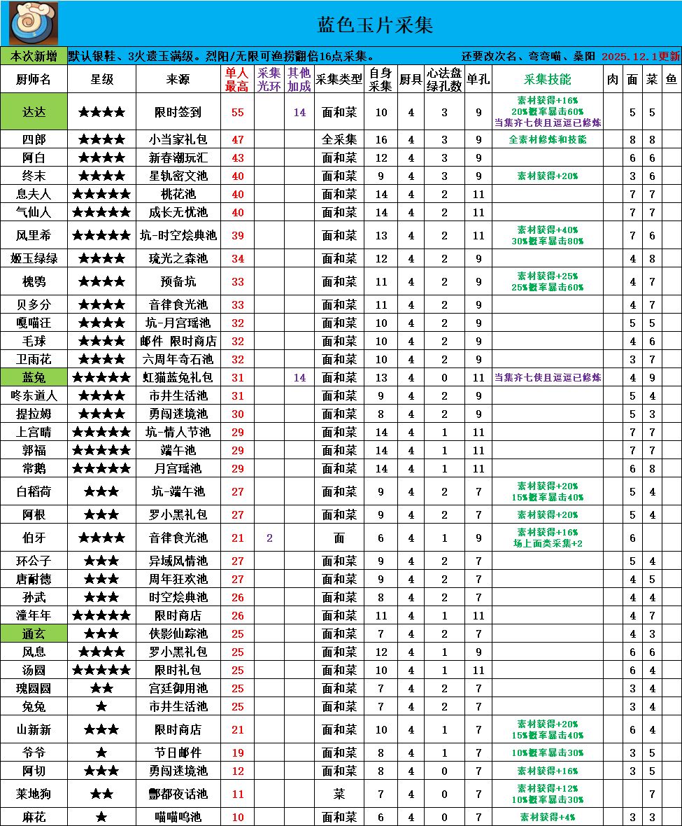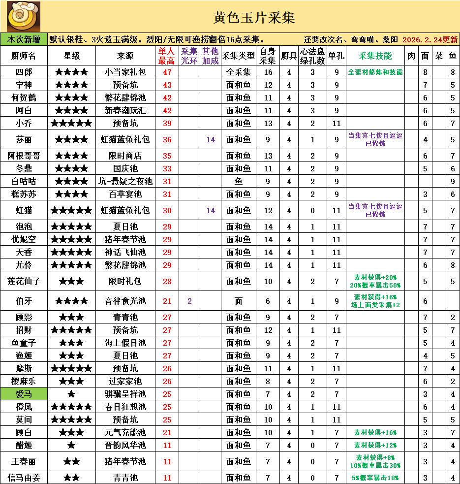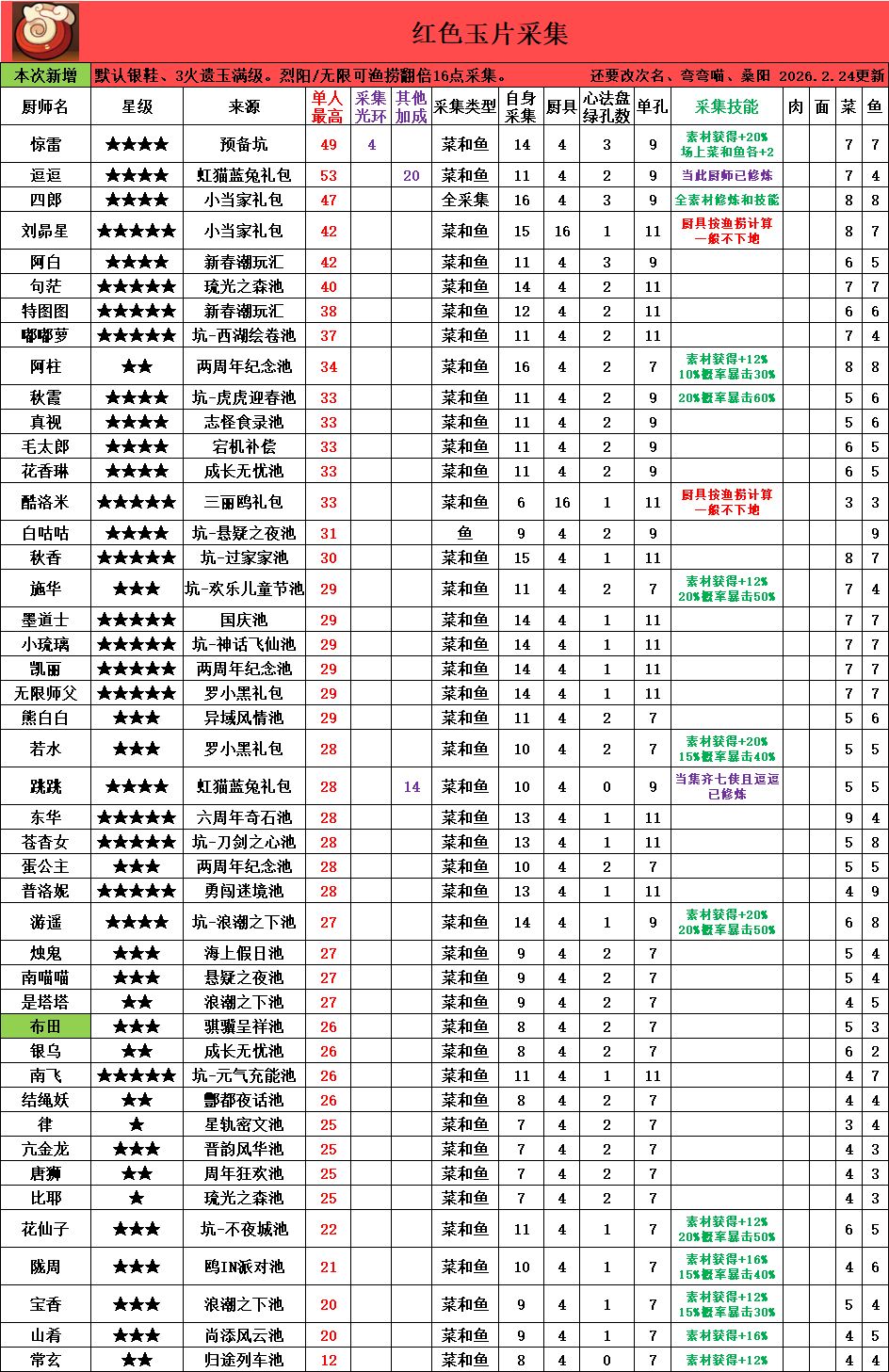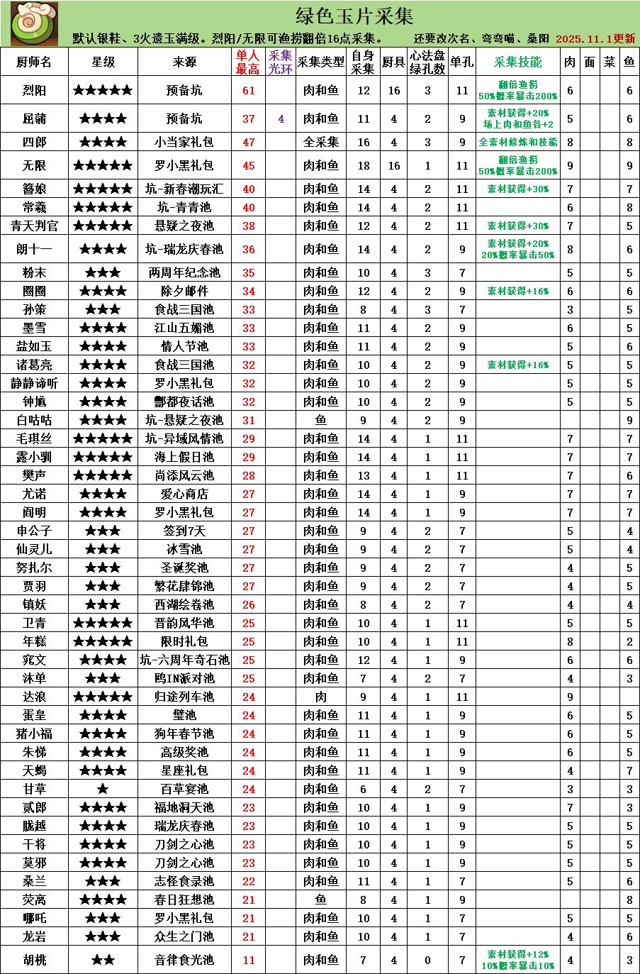 然后这玩意怎么看呢,就拿粉色玉片区举个🌰,首先找到你要上采集点的两个厨师,比如我最高的肉菜采集是玉弥香和尖椒鸡和秋风,也就是53 33 25,那么我单上一个玉弥香是在45点数;上玉弥香和尖椒鸡是86,也就是在75点数;上玉弥香,尖椒鸡,秋风是111,也就是105点数。对比一下三个点数的数据,就是一采45>三采105>二采75,所以采集点是上场一个人最好,其次是上场三个人,最后是上场两个人。