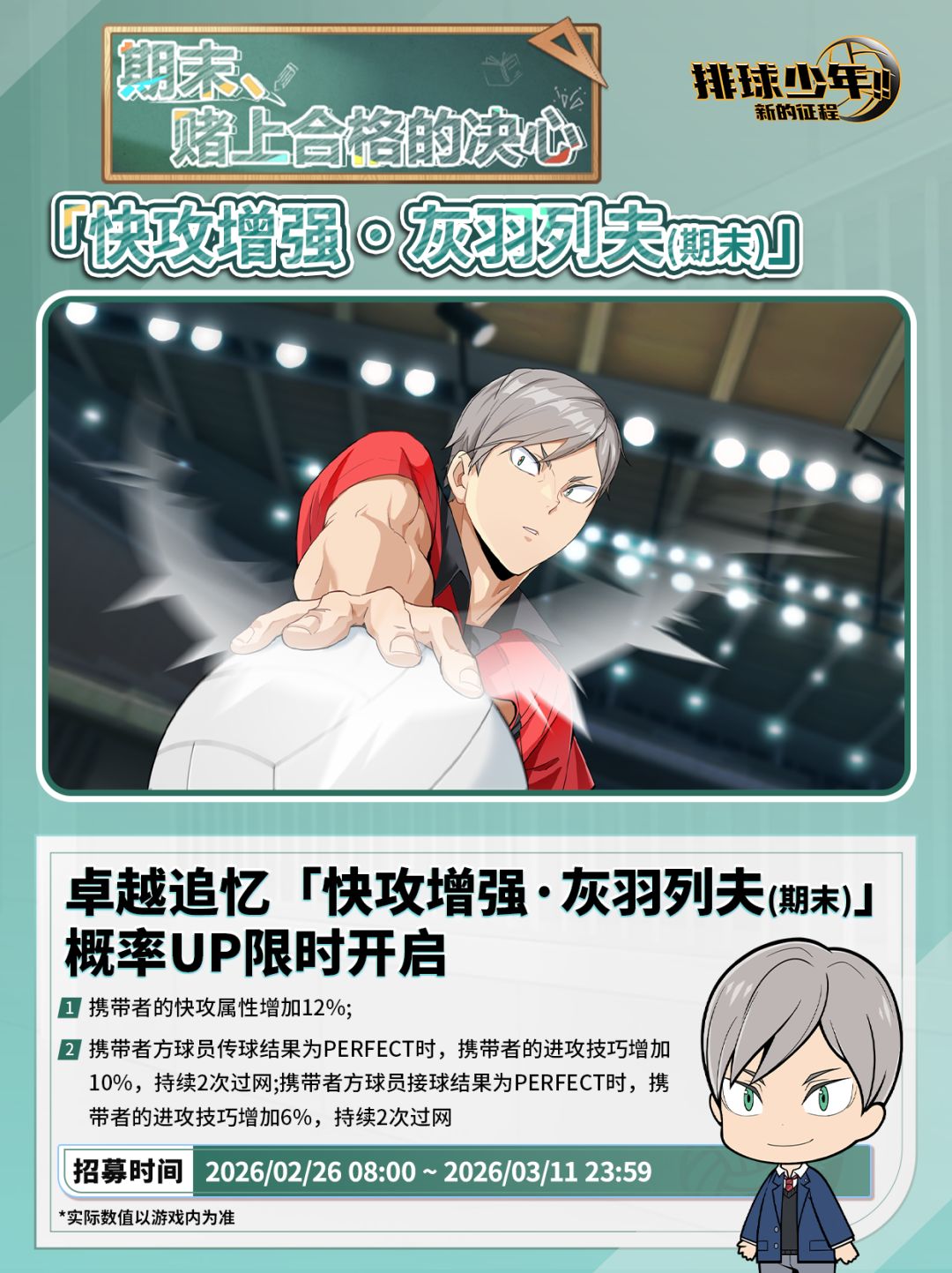 🏐卓越追忆招募限时开启:「快攻增强・灰羽列夫(期末)」。