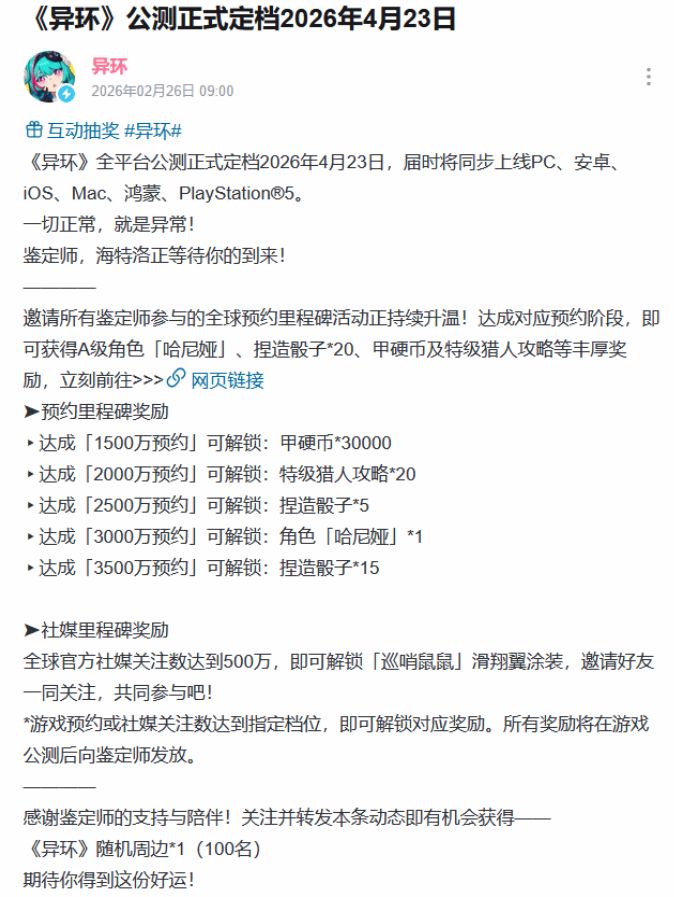 全平台来袭!《异环》公测定档2026年4月23日