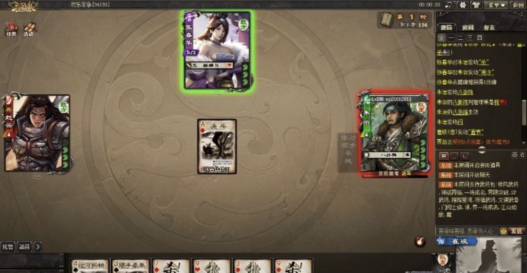 若目标角色均与你体力值相同,你摸一张牌。这里的目标角色是上面介绍的三种情况。指定自己为目标时,体力值是和自己比,所以,对自己使用的牌都可以再摸一张。单指目标时,需要判断你使用手牌时,对方体力值是否和你相同,如果相同,可以摸一张牌,因此对体力值相同的角色使用牌时,优先使用非伤害牌(顺手牵羊、过河拆桥、乐不思蜀、兵粮寸断),最后再使用伤害牌(杀、决斗、火攻),这样可以多摸牌。多指定目标的牌,在场上人数较多时,会比较难摸牌,在场上人数较少或者单挑状态下,也是有机会摸牌的。