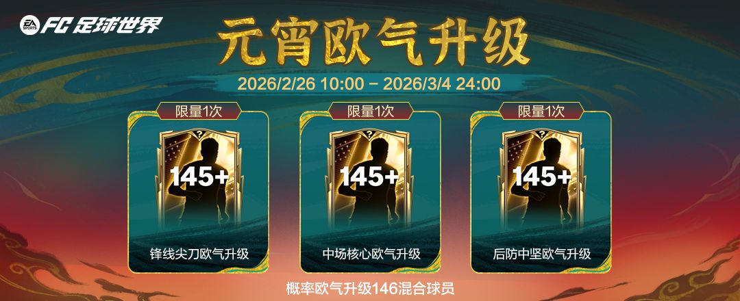 2月26日10:00-3月4日24:00,元宵欧气升级玩法限时开启,参与元宵欧气升级交换,有概率获得更高能力值球员卡。本次元宵欧气精选升级卡池分为三组,分别是锋线尖刀欧气升级、中场核心欧气升级、后防中坚欧气升级,每个能力值的卡池限量交换1次。