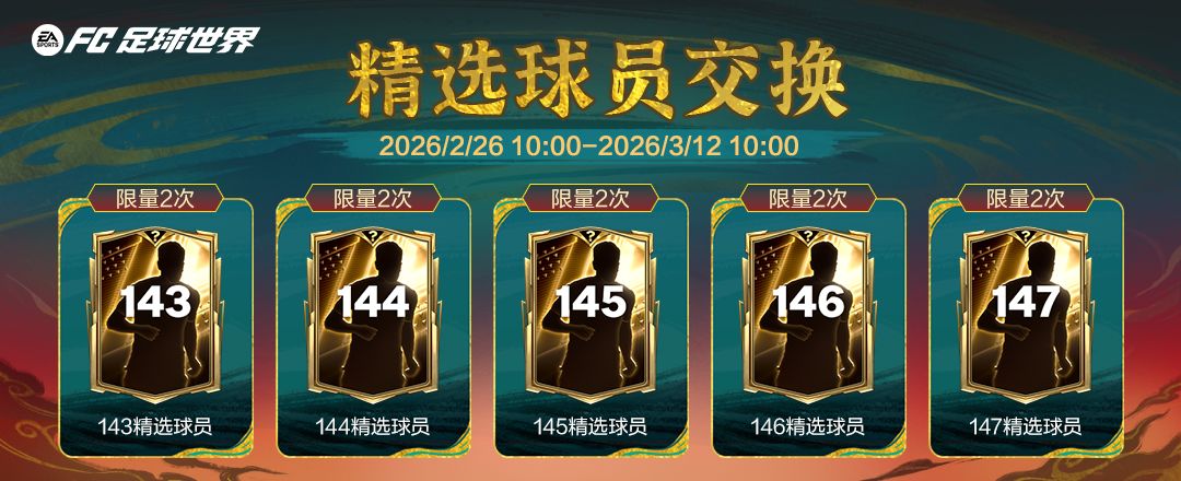2月26日10:00-3月12日10:00,玩家可以参与143-147能力值,全新一期的精选球员交换,每个能力值的卡池限量交换2次,众多顶级球星等你来拿!