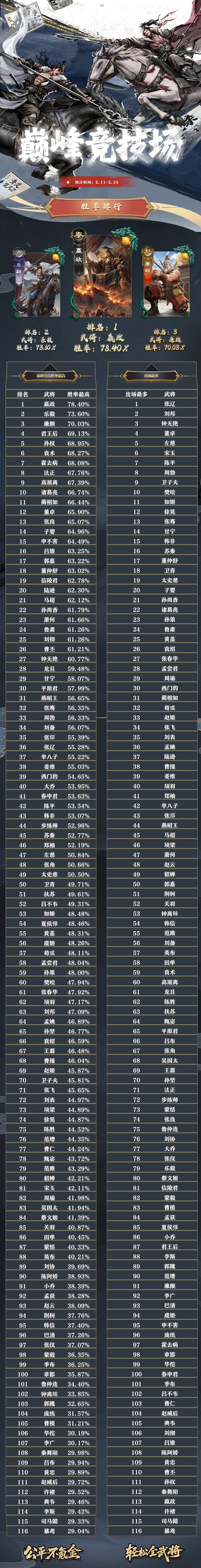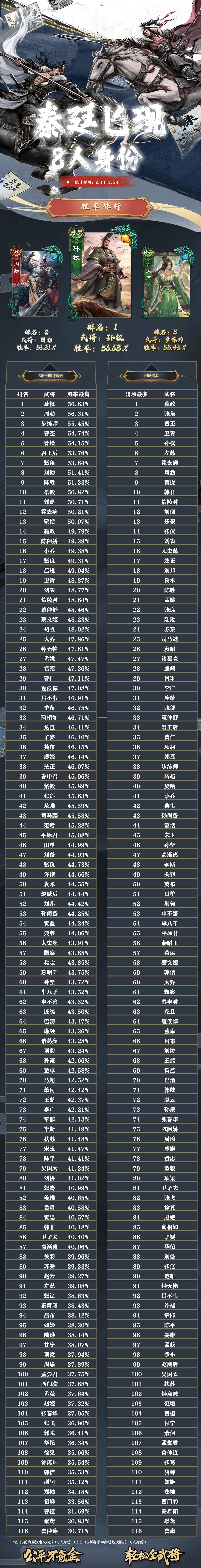 名将杀武将胜率排行(2.11~2.24)