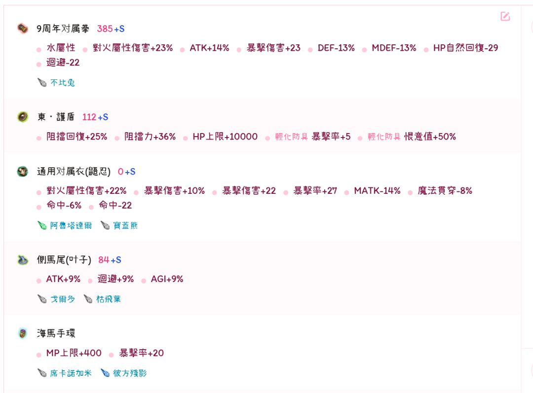 咩咩和酥饼都有MP,和海马的区别是,前两者+5稳定,后者+20暴击,算是比较两可的抉择,也就是选哪个都行。但海马+20暴击,能让拳的常态暴击来到155,或者让拳少吃一个暴击料理,我觉得是比+5稳定这种纯粹的增伤要好的。比起提伤害上限,我觉得让自己打得舒服更重要。但这里只是我个人想法,其实咩咩酥饼完全是可选的。