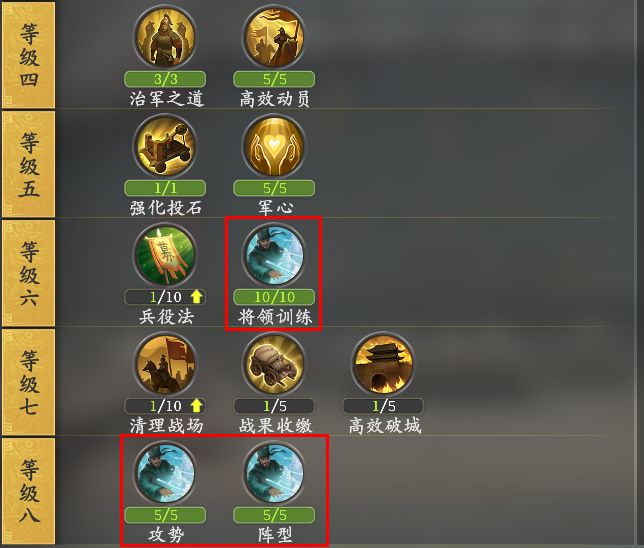 T1.5:【高效动员】因为这个撤退才能吃到,所有不如急行军;【治军之道】,看配队拉就行。