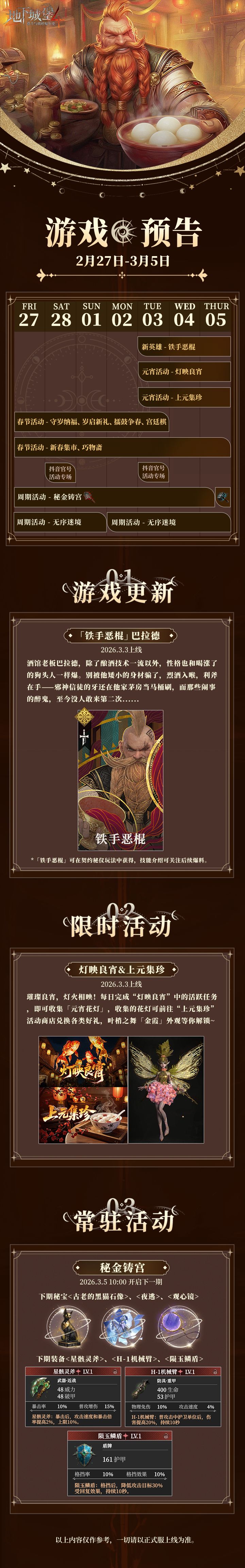 堡主们好,本周的游戏预告来啦!元宵佳节将至,福利活动自然少不了,此外先前已经和大家打过一次照面的铁手恶棍也将正式登场,详情请看下方长图——