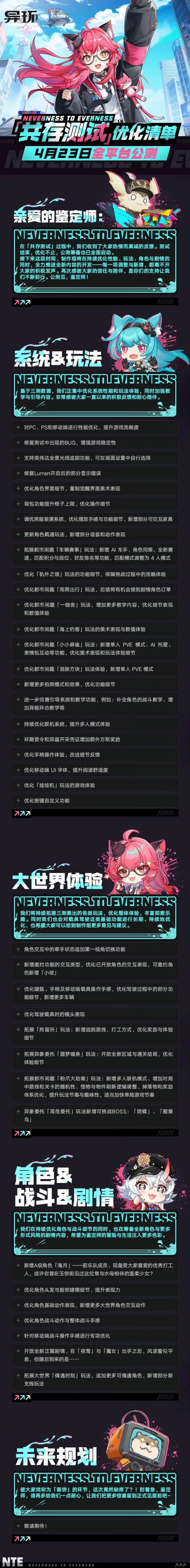 今日,《异环》官方发布重磅消息,正式公布“共存测试”优化清单,并宣布游戏全平台公测定档4月23日。官方表示,测试期间收集的玩家反馈将转化为多项优化内容,所有调整均会在公测前完成,以更完善的品质与玩家见面。