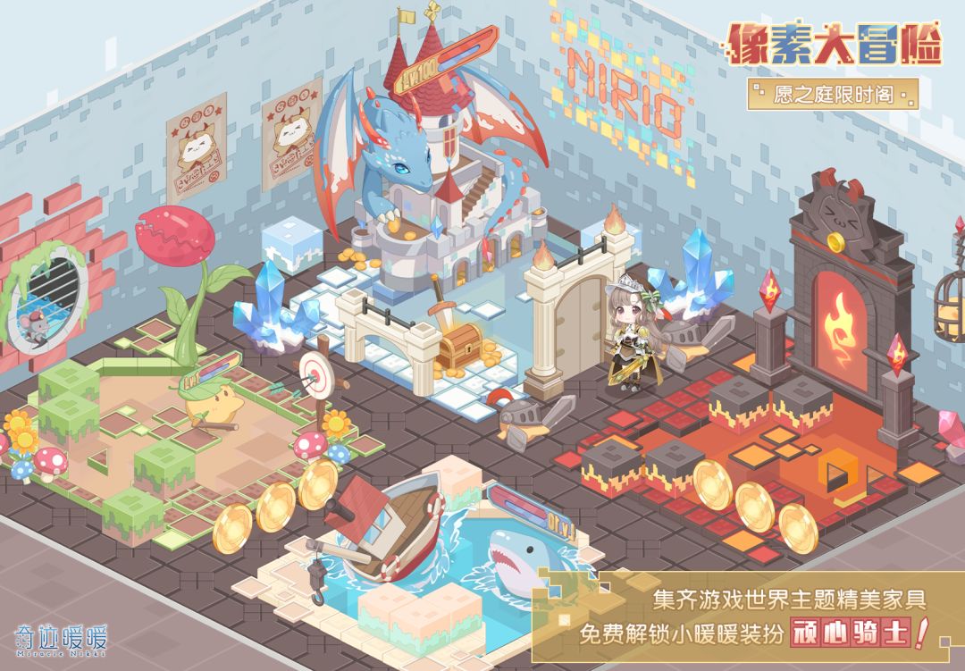 3月9日5:00—3月15日23:59,在小屋限时抽奖阁“像素大冒险”许愿,可获得游戏世界主题家具!集齐所有限时家具还可解锁小暖暖装扮“顽心骑士”!