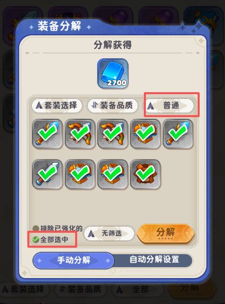 点击背包装备分解(把普通装备都分解了,右上角可以筛选)