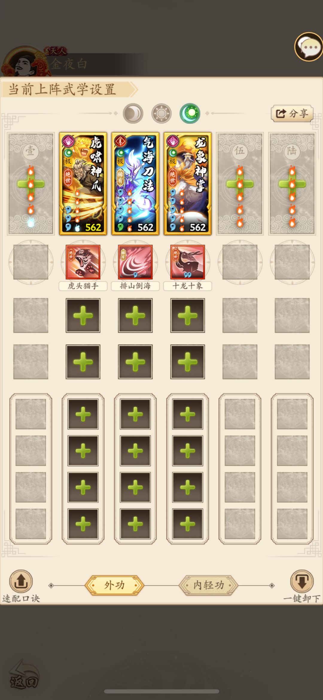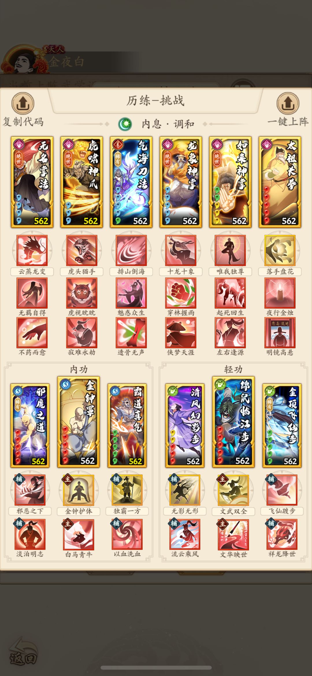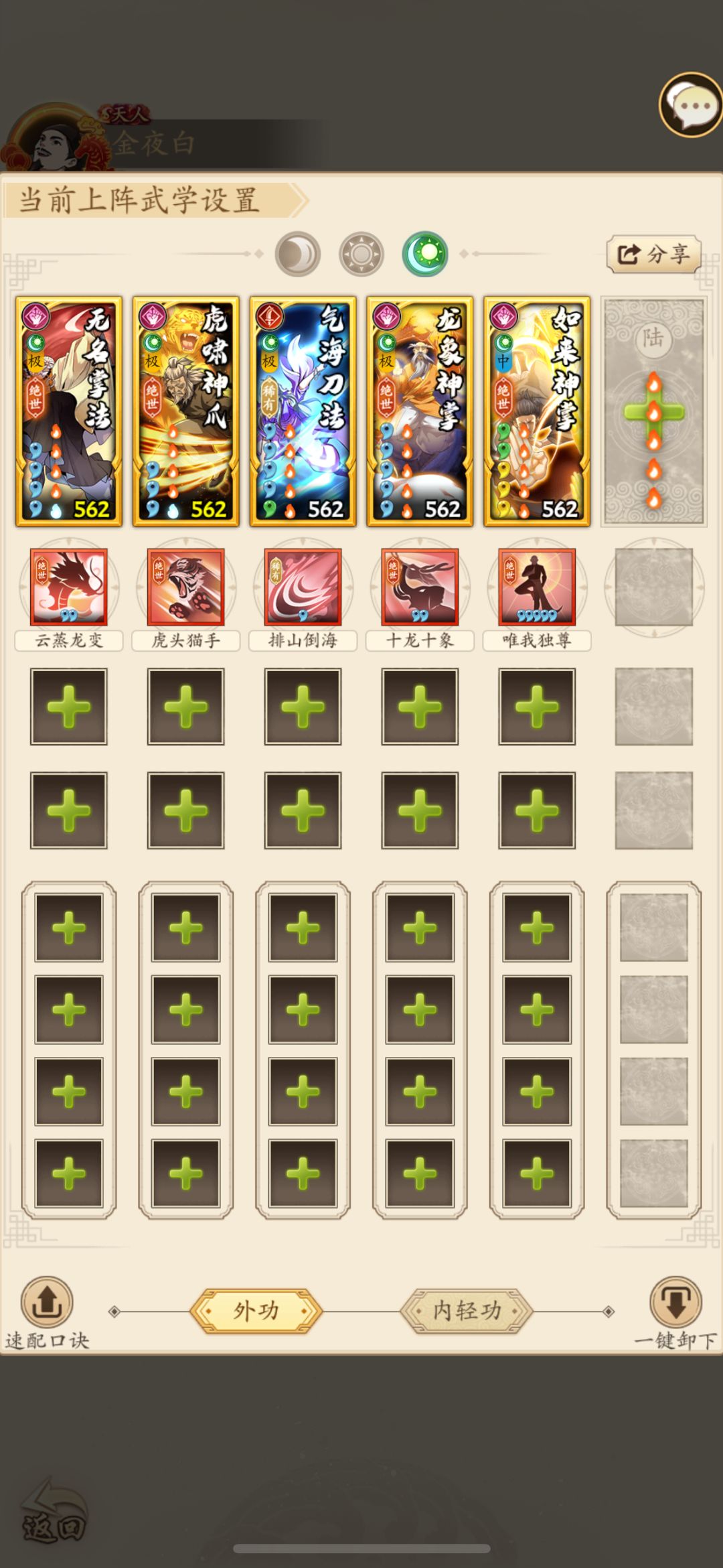 剩下一个位置选出手/后手武学。暂时用太祖,补一点属性。如果有高勾稀有/绝世,尽管换。比如无相/赤炼/游云,招式带三出手。如果你没有高调,可以换成三后手,选择2回合的后手招式,在无名回合打出。