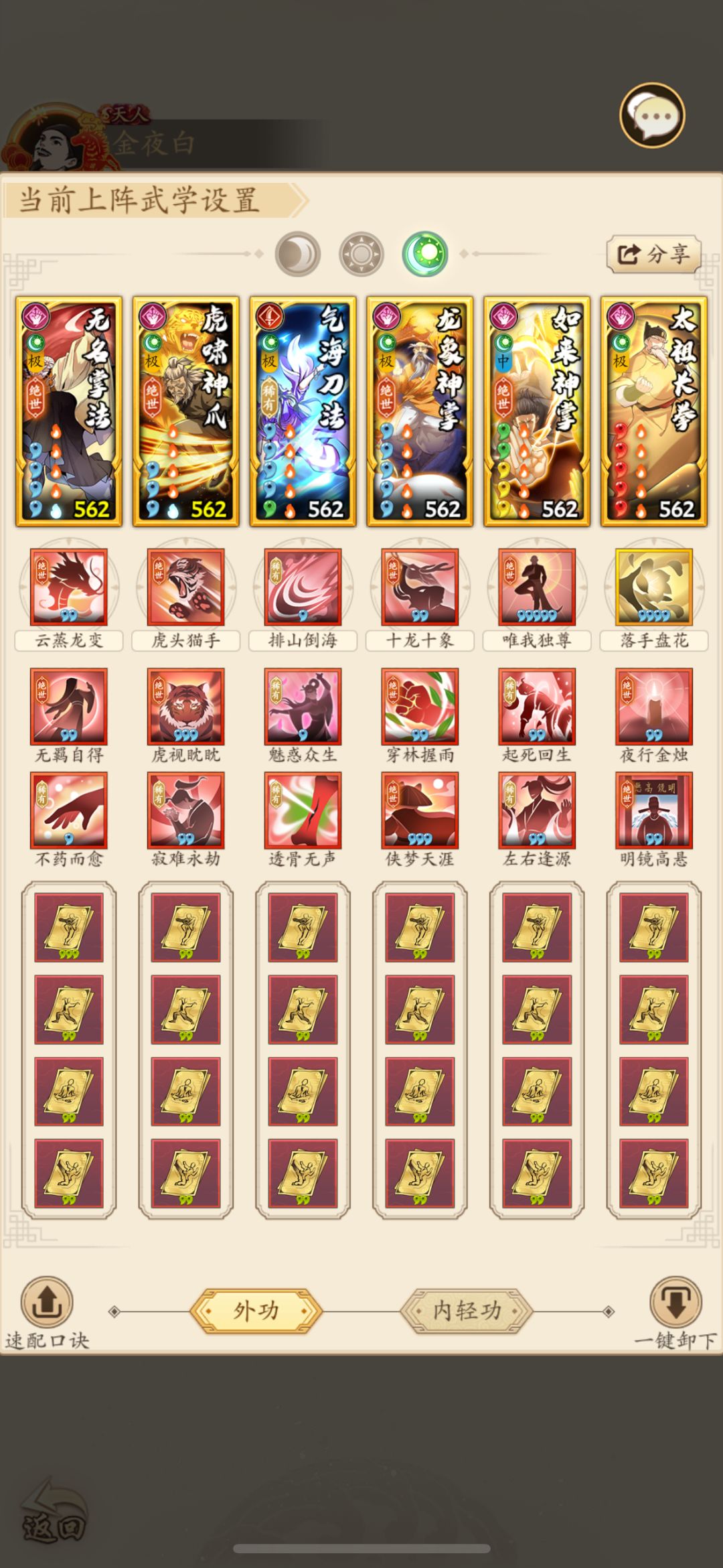 然后放置两个暴击武学。无名与如来。如来的暴击/破绽/回血/招伤,都很有用。虽然是调和中,亏属性。但50暴击属实无可替代。(没关系,我别的绝世更没勾……)