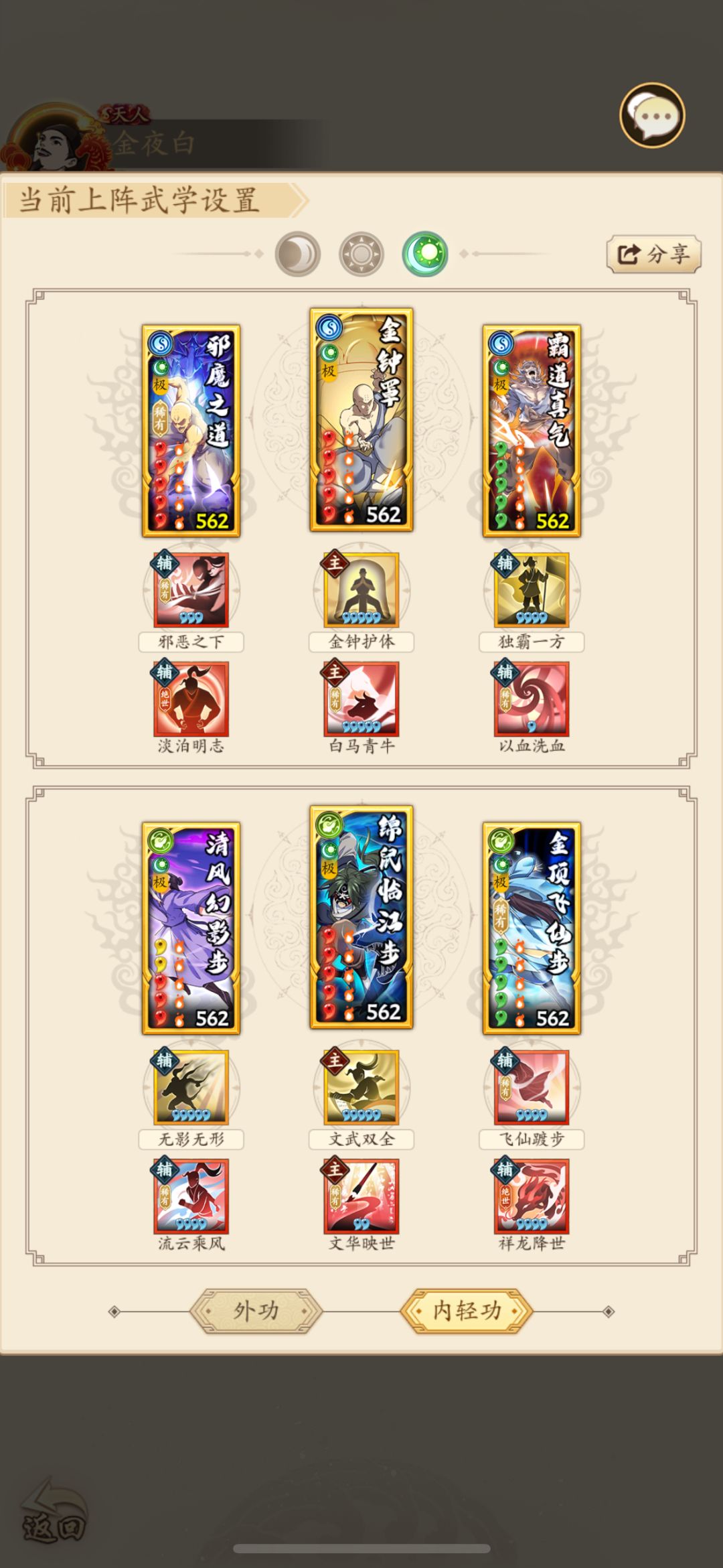 这两个精进武学一前一后,作为两个后手爆发点,形成循环。这里比较灵活,也可以互换位置。暂且选择无名在前,如来在后,六号位可以吃到破绽与招伤。
