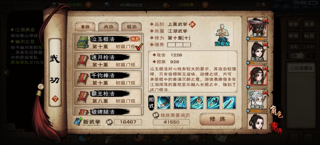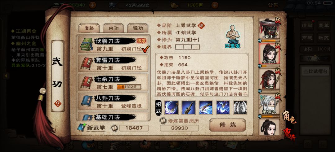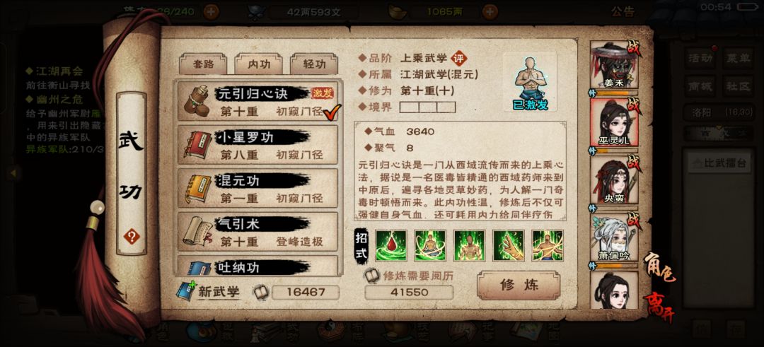 萧的话,因为主角的缘故,正在学拳,镇派拳目前能拿到的只有烈阳(需要300银两),内功也是不知道用哪个。