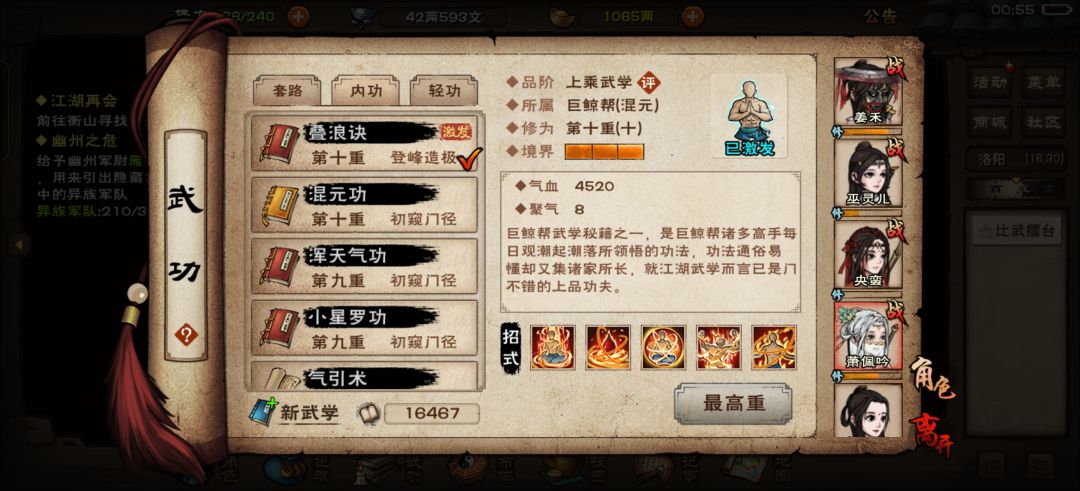 镇派内(离火缺钱,乾元还在打听,龙象得等下个星期)主后面该怎么去学武学呢,要不要把镇派道心升到十重再去学套路,或者是学掏蛋手,用上乘道心;