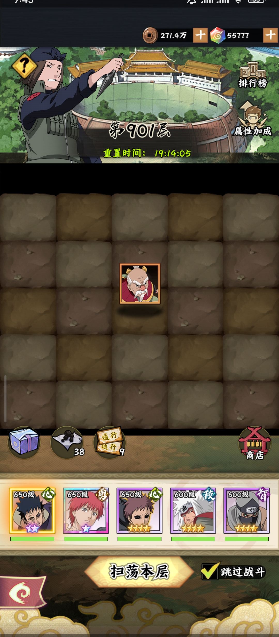 我的配置:带土30专,蝎20,罗莎20,角度10,我爱罗打酱油。主要是没有影饰品,俩个红垃圾饰品,而且属性还是垃圾中级的。神器更垃圾,就一个红1星瓶,其他都3-5星左右。今天打了1个多小时的据点到755层。简单记录一下,到100在记录吧。就这样