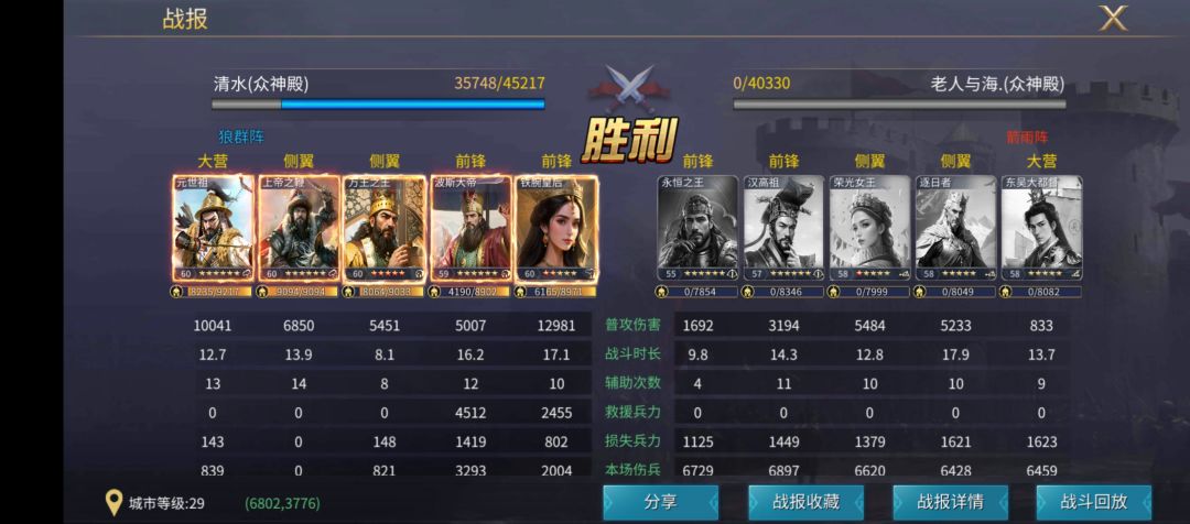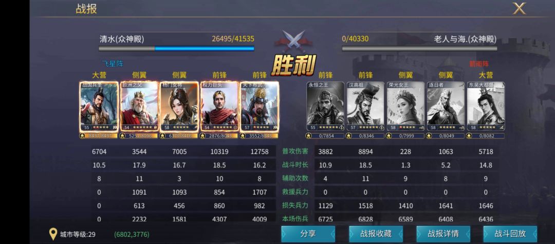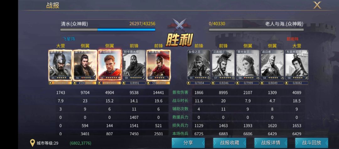 我分别用同样的五骑兵,组锋矢、锋翼、狼群来进行测试,双方的队伍练度相近,战报大家已经看到了,我们不但要知其然,还要知其所以然,在大家没有上述英雄时,可以明确核心逻辑后,选择适当的英雄进行替换,起到相同的效果。