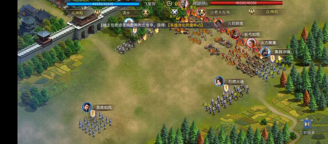我特意观看战斗回放,飞星阵对阵箭雨阵时,开局飞星阵的前锋两个位置直接可以贴身箭雨阵的侧翼,而侧翼则是箭雨阵最核心的输出位置,而穆桂英携带投火兵,具有“对器械类伤害提高46%”的效果,虽然弹药量只有1,但通过战斗回放可以看到,开局配合天下布武,直接就秒了箭雨阵的一个侧翼队伍!这个阵容在实战中,还有几个关键点: