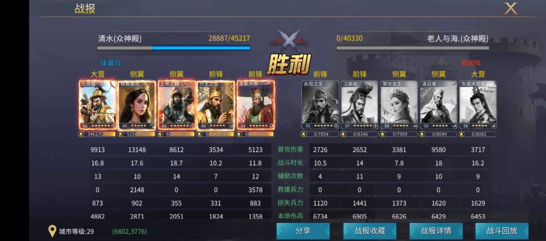 因为在文明1前苟的比较严重,导致现在缺大量银币,所以这队飞星,是书没打,兵种在4-5级的情况下的战斗结果。