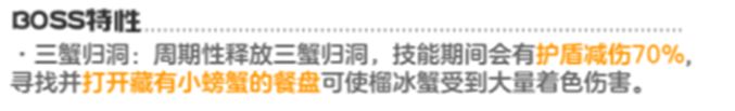 应对技巧:该BOSS拥有独特打法技巧,BOSS会召唤三个餐盘其中一个餐盘中含有小螃蟹,如果玩家找到则会BOSS造成大量着色害打出BOSS的弱点击破状态,此时玩家可以对BOSS进行大幅度灌伤