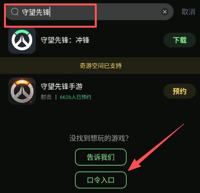 第二步:奇游内搜索守望先锋,点击下方口令入口,敲口令OWM解锁权限
