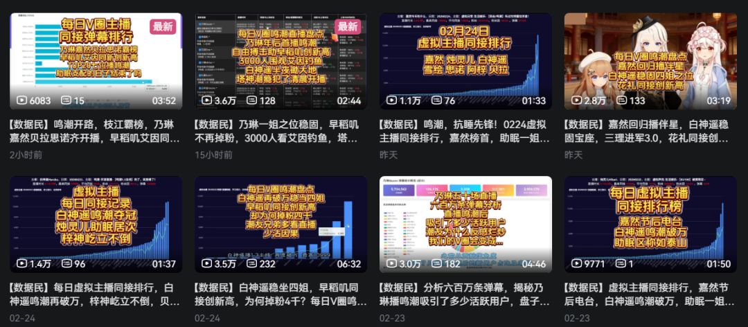 这款游戏,几乎就是V圈最近几个月的流量密码。大部分主播只要正常游玩,基本都能稳定获得一波正向收益,热度、粉丝数均有不同程度的上涨。甚至有UP主专门开辟了系列栏目,统计和盘点V圈每天玩《鸣潮》的主播各自战况如何。