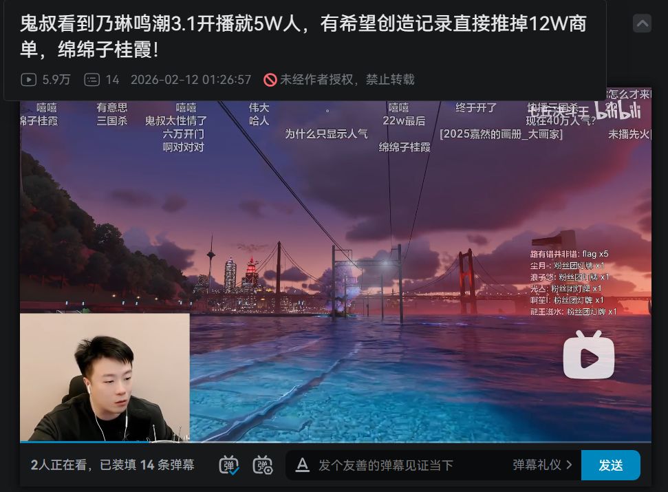 第三点就很神奇了。本身在2个多月的游玩里,乃琳直播间就已经积蓄了一大批忠实观众,开播就有了5万同接。而3.1又是《鸣潮》粉丝们力推的好内容,于是在热度新高的时刻,不少人开始呼朋唤友、主动引流,甚至有头部主播推掉自己的直播,赶来声援乃琳……