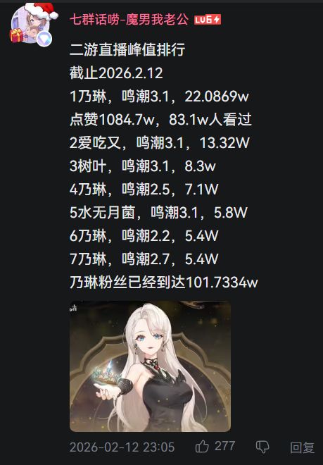 至此,在所有直播《鸣潮》的主播中,乃琳拿下了一个断档式领先的峰值,粉丝数也顺势突破了100万。